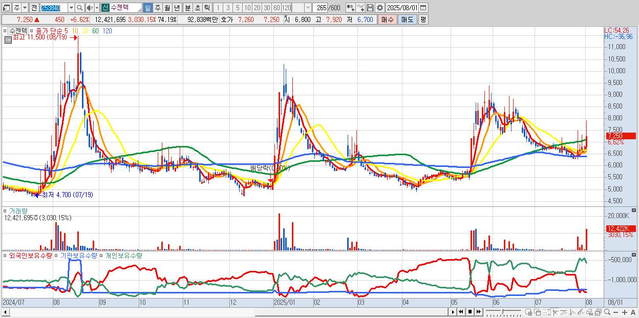 - 수젠텍 (7,250원 ▲ 6.62% , 시총: 1,214억, 거래량: 12,421,695, 거래대금:928억)