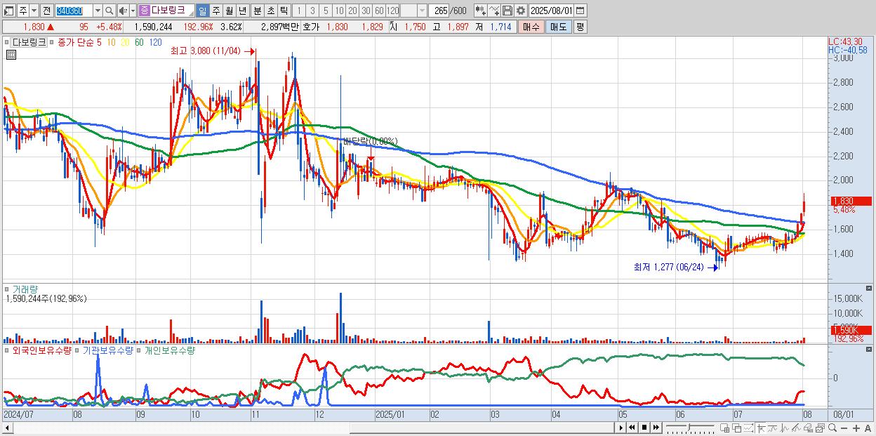 - 다보링크 (1,830원 ▲ 5.48% , 시총: 804억, 거래량: 1,590,244, 거래대금:29억)