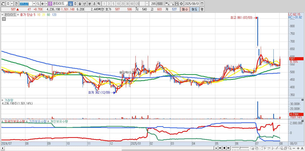 - 온타이드 (587원 ▲ 8.7% , 시총: 401억, 거래량: 4,236,198, 거래대금:24억)