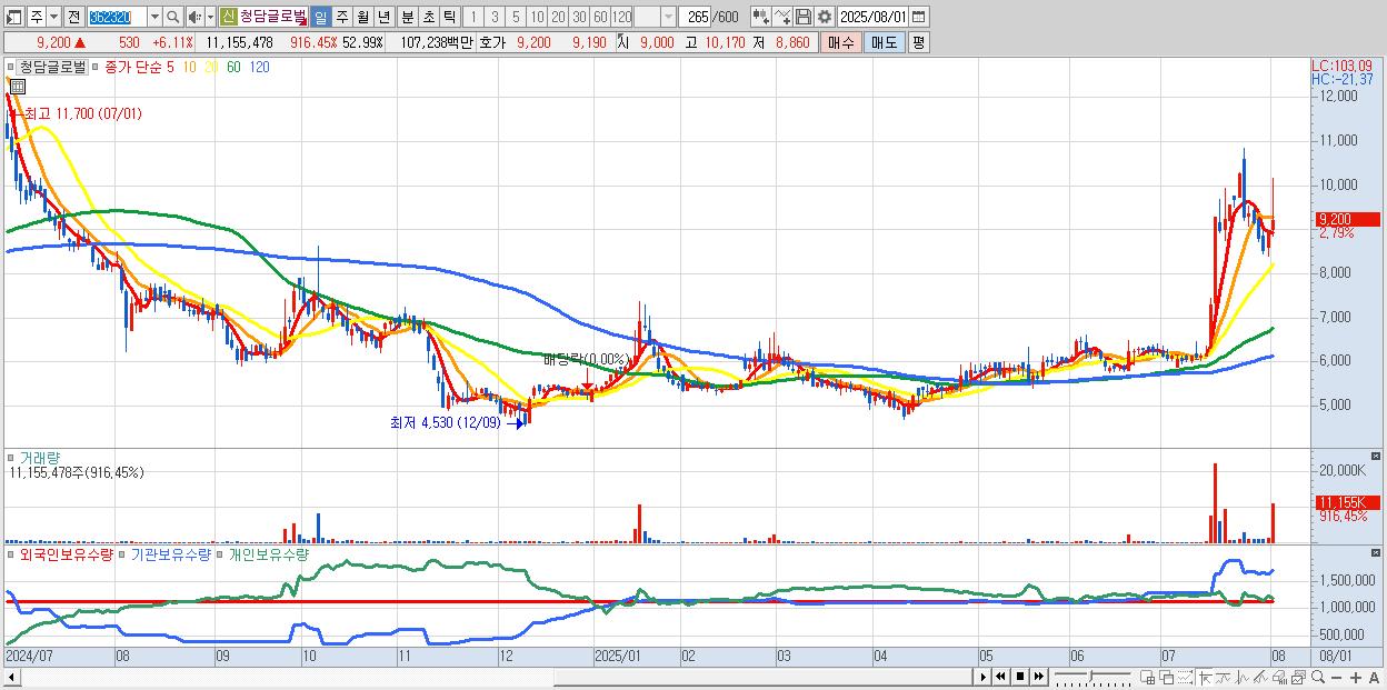 - 청담글로벌 (9,190원 ▲ 6% , 시총: 1,935억, 거래량: 5,061,301, 거래대금:490억)