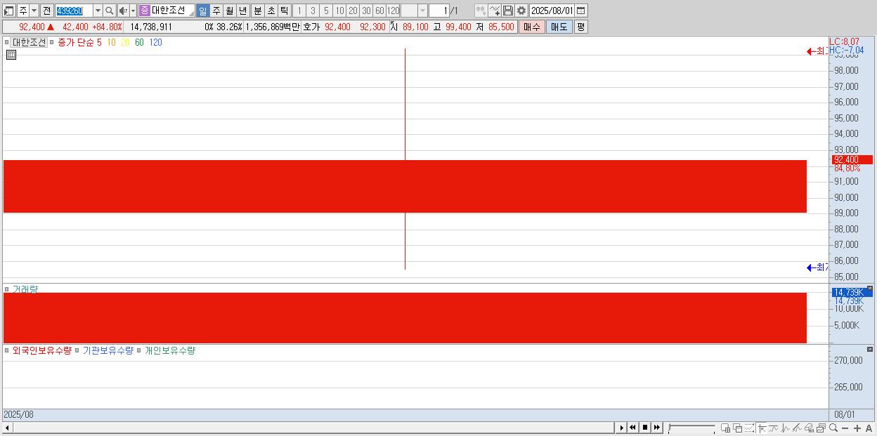 (서울=연합뉴스) 고은지 기자 = 중대형 선박 조선 전문기업인 대한조선이 코스피 상장 첫날인 1일 85% 가까이 급등했다. 한국거래소에 따르면 이날 코스피시장에서 대한조선은 공모가(5만원) 대비 4만2천400원(84.80%) 오른 9만2천400원에 거래를 마쳤다. 신규 상장 효과에 한미 관세협상 타결에 따른 조선주 호조세를 타고 개장 직후부터 오름세를 지속…