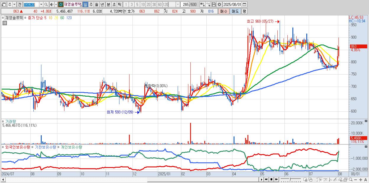 - 재영솔루텍 (863원 ▲ 4.86% , 시총: 783억, 거래량: 5,466,467, 거래대금:47억)