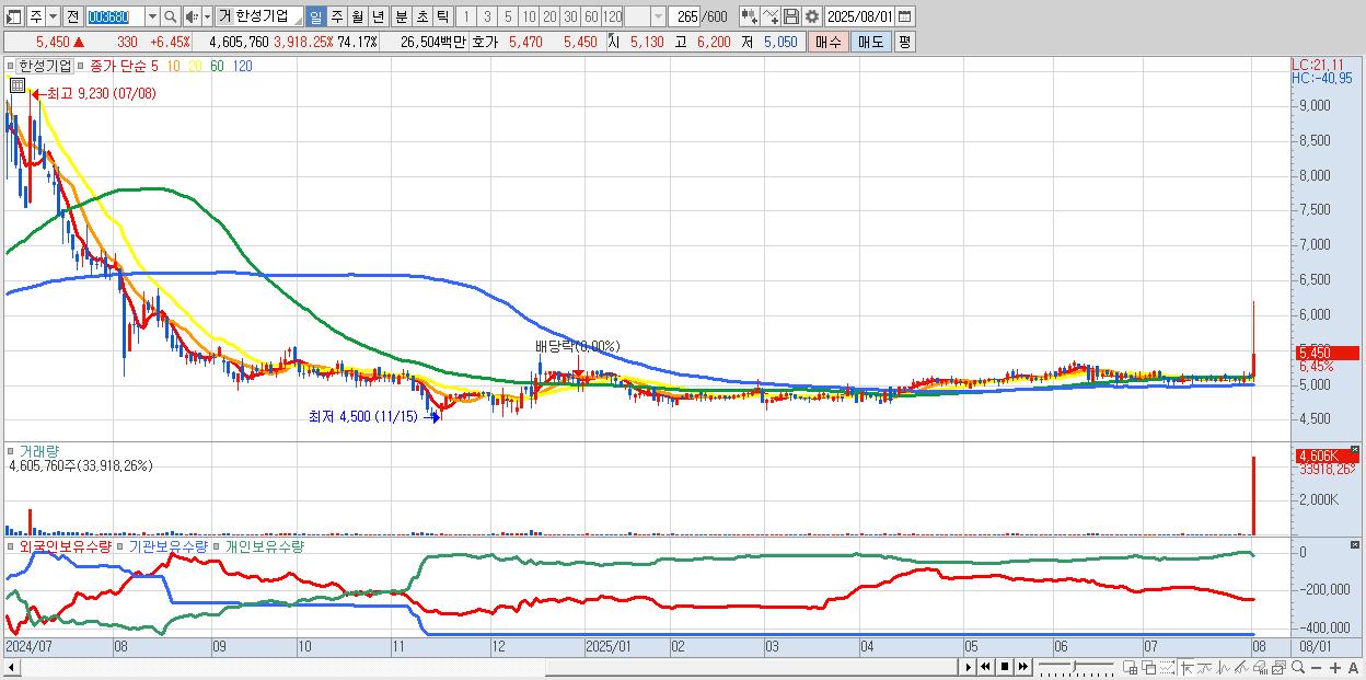 - 한성기업 (5,450원 ▲ 6.45% , 시총: 338억, 거래량: 4,605,760, 거래대금:265억)