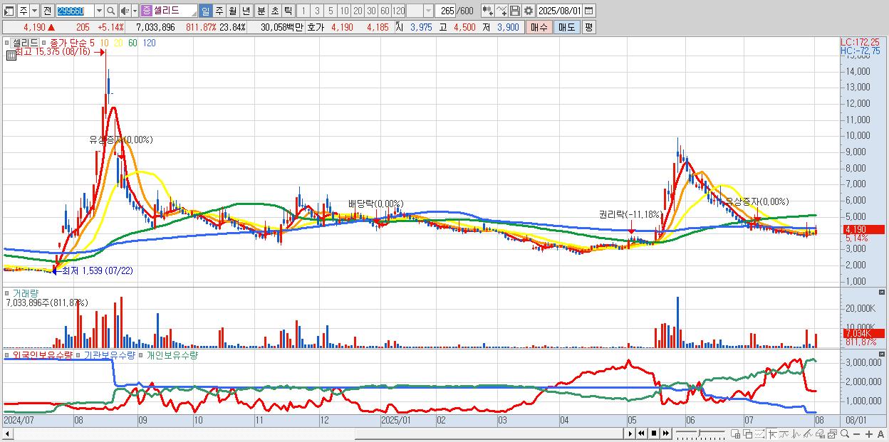 - 셀리드 (4,190원 ▲ 5.14% , 시총: 1,236억, 거래량: 7,033,896, 거래대금:301억)