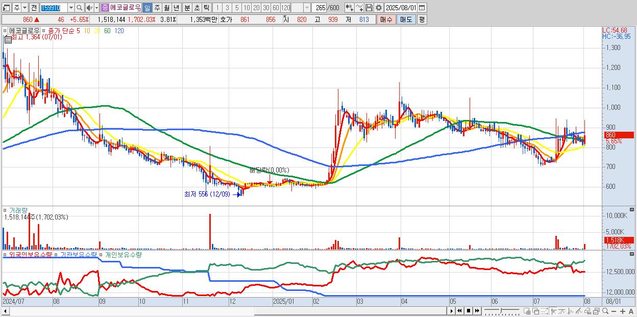 - 에코글로우 (860원 ▲ 5.65% , 시총: 343억, 거래량: 1,518,144, 거래대금:14억)