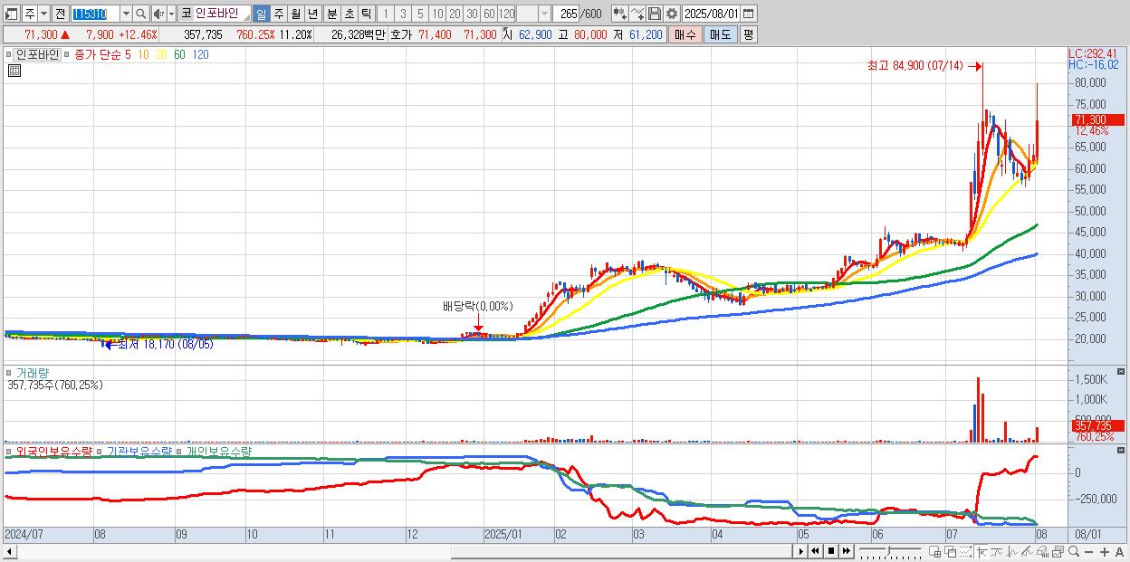 - 인포바인 (71,300원 ▲ 12.46% , 시총: 2,277억, 거래량: 357,735, 거래대금:263억)