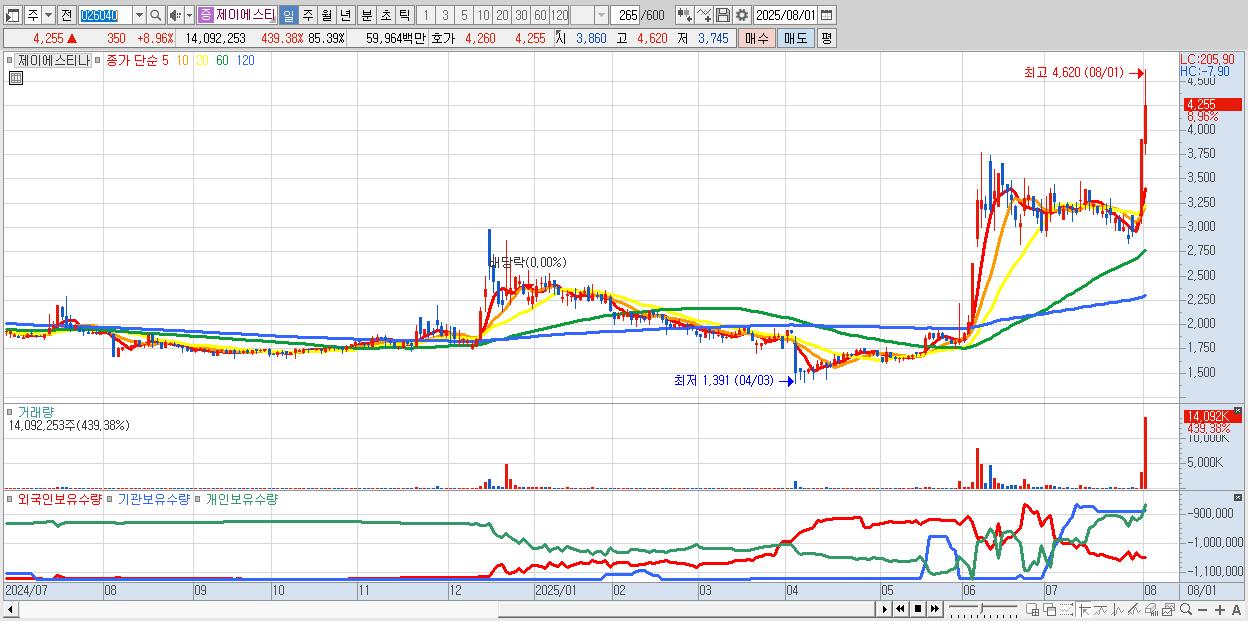 - 제이에스티나 (4,255원 ▲ 8.96% , 시총: 702억, 거래량: 14,092,253, 거래대금:600억)