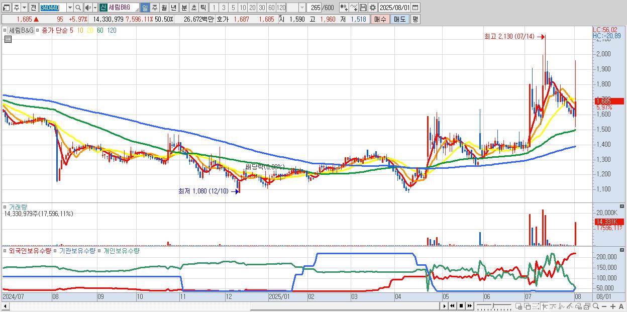 - 세림B&G (1,685원 ▲ 5.97% , 시총: 478억, 거래량: 14,330,979, 거래대금:267억)