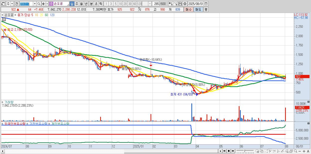 - 손오공 (922원 ▲ 7.46% , 시총: 602억, 거래량: 7,842,270, 거래대금:73억)