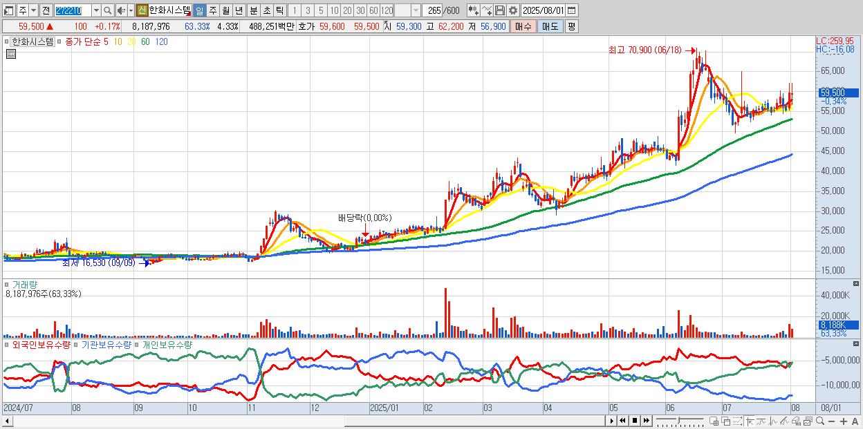 - 한화시스템 (59,900원 ▲ 0.84% , 시총: 113,163억, 거래량: 3,863,528, 거래대금:2,291억)