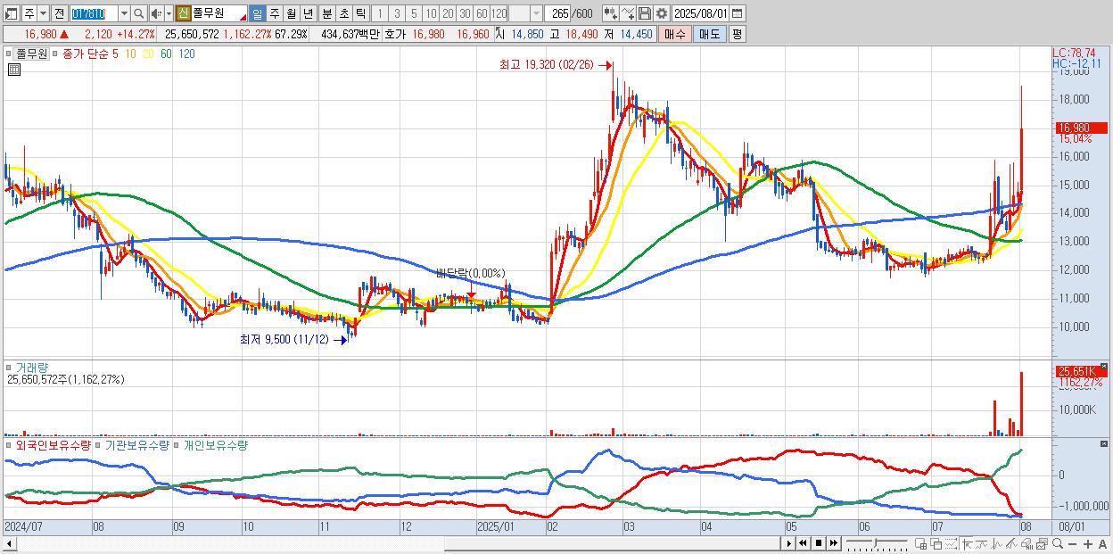 - 풀무원 (17,670원 ▲ 18.91% , 시총: 6,736억, 거래량: 13,684,477, 거래대금:2,317억)