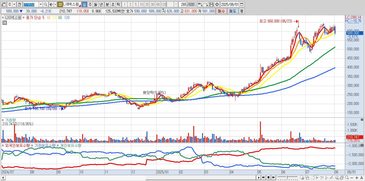 - LIG넥스원 (592,000원 ▼ -5.73% , 시총: 130,240억, 거래량: 160,271, 거래대금:953억)