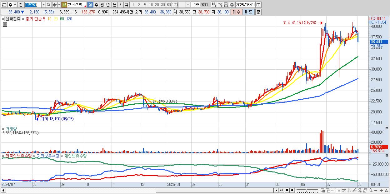 - 한국전력 (36,150원 ▼ -6.23% , 시총: 232,070억, 거래량: 4,178,937, 거래대금:1,536억)