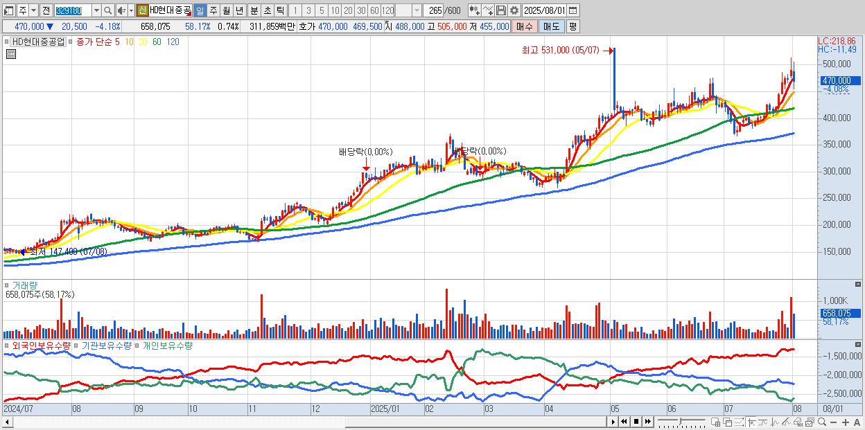 - HD현대중공업 (476,500원 ▼ -2.85% , 시총: 423,004억, 거래량: 440,367, 거래대금:2,079억)