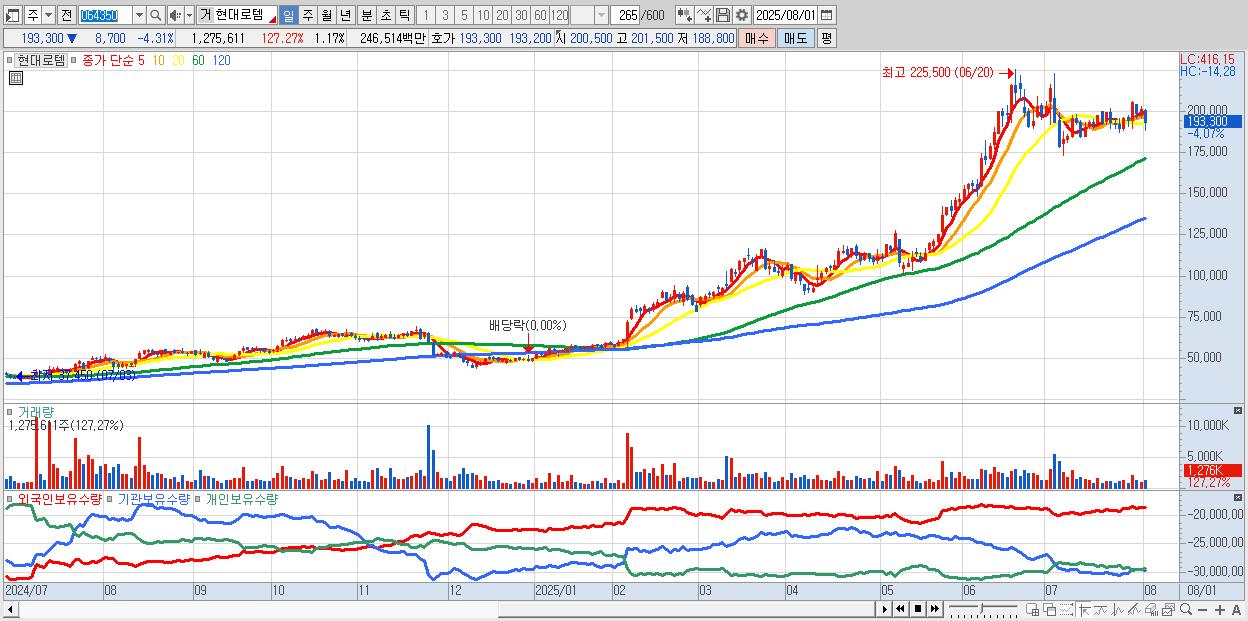 - 현대로템 (194,000원 ▼ -3.96% , 시총: 211,736억, 거래량: 900,727, 거래대금:1,738억)