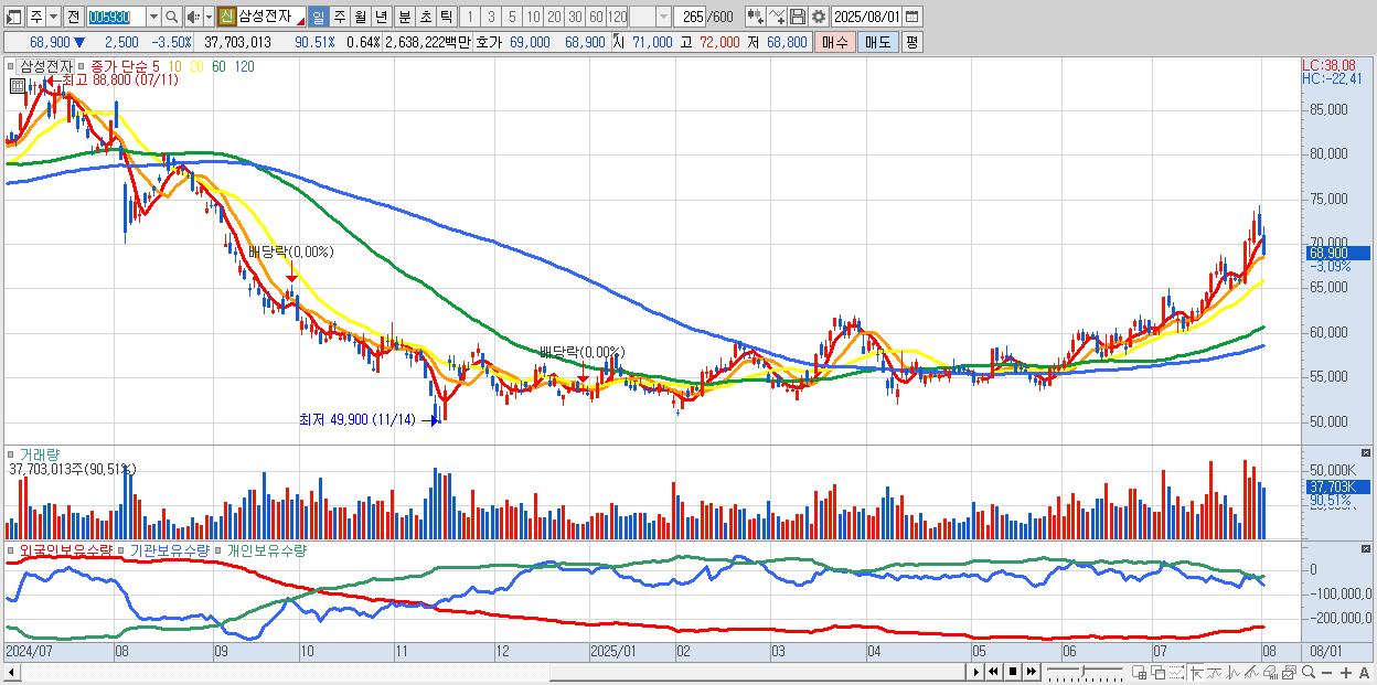 1.삼성전자 68,900원 ▼ -3.5% (KOSPI, 005930)