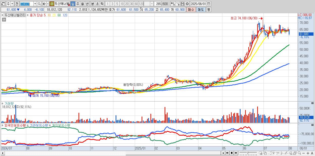 - 두산에너빌리티 (61,400원 ▼ -6.4% , 시총: 393,305억, 거래량: 9,805,226, 거래대금:6,111억)