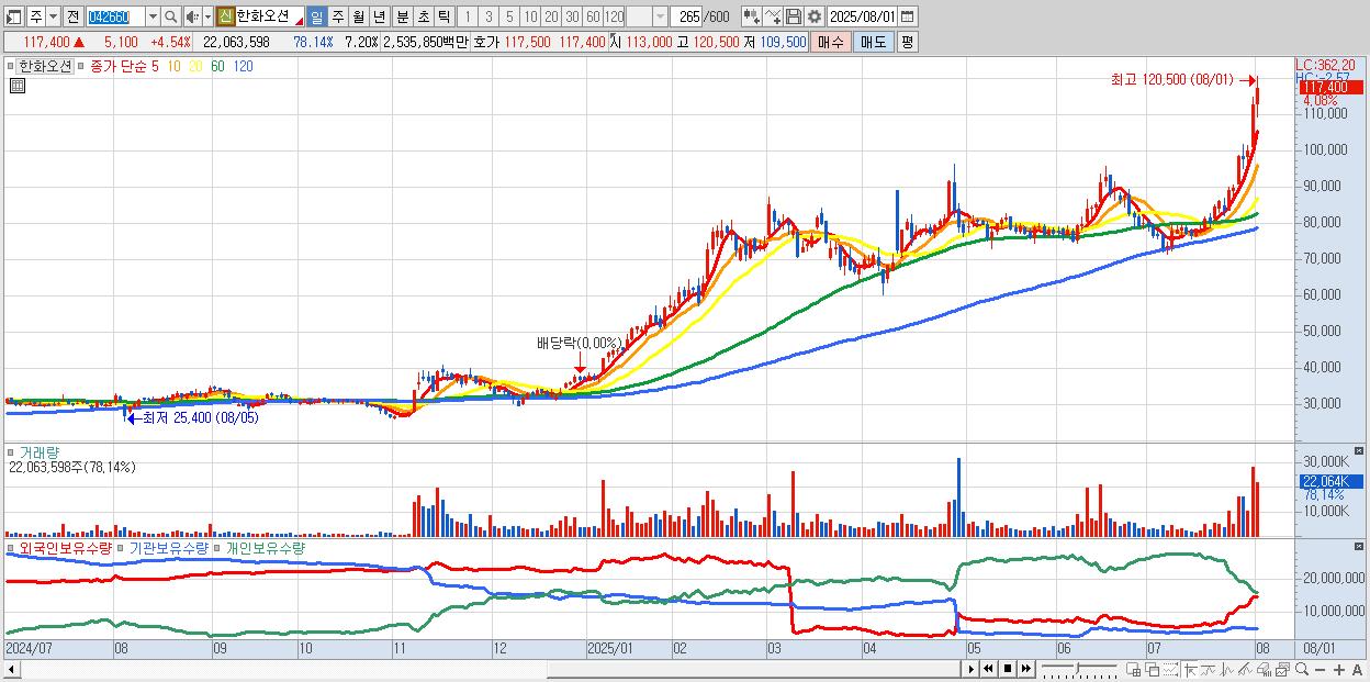 - 한화오션 (117,400원 ▲ 4.54% , 시총: 359,729억, 거래량: 9,262,548, 거래대금:10,586억)