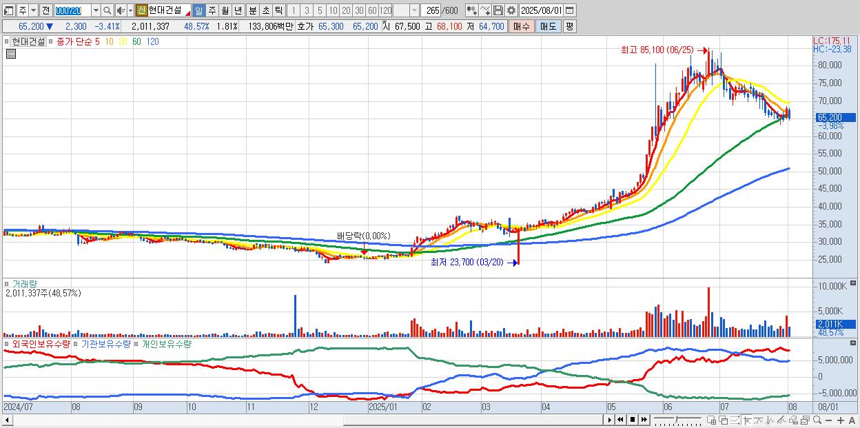 - 현대건설 (65,600원 ▼ -2.81% , 시총: 73,049억, 거래량: 1,430,676, 거래대금:952억)