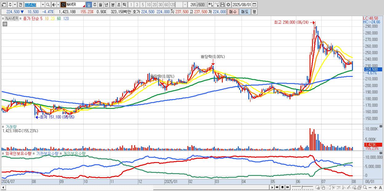 - NAVER (225,000원 ▼ -4.26% , 시총: 356,483억, 거래량: 827,729, 거래대금:1,878억)