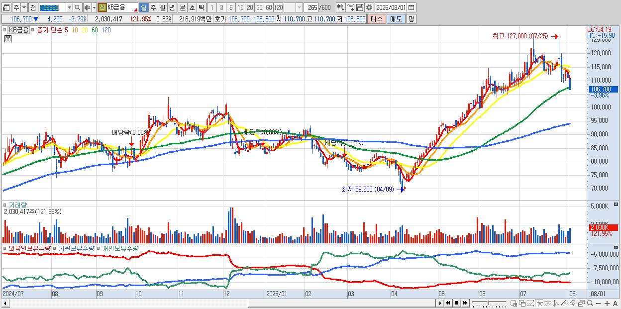- KB금융 (106,000원 ▼ -4.42% , 시총: 404,350억, 거래량: 1,884,341, 거래대금:2,013억)