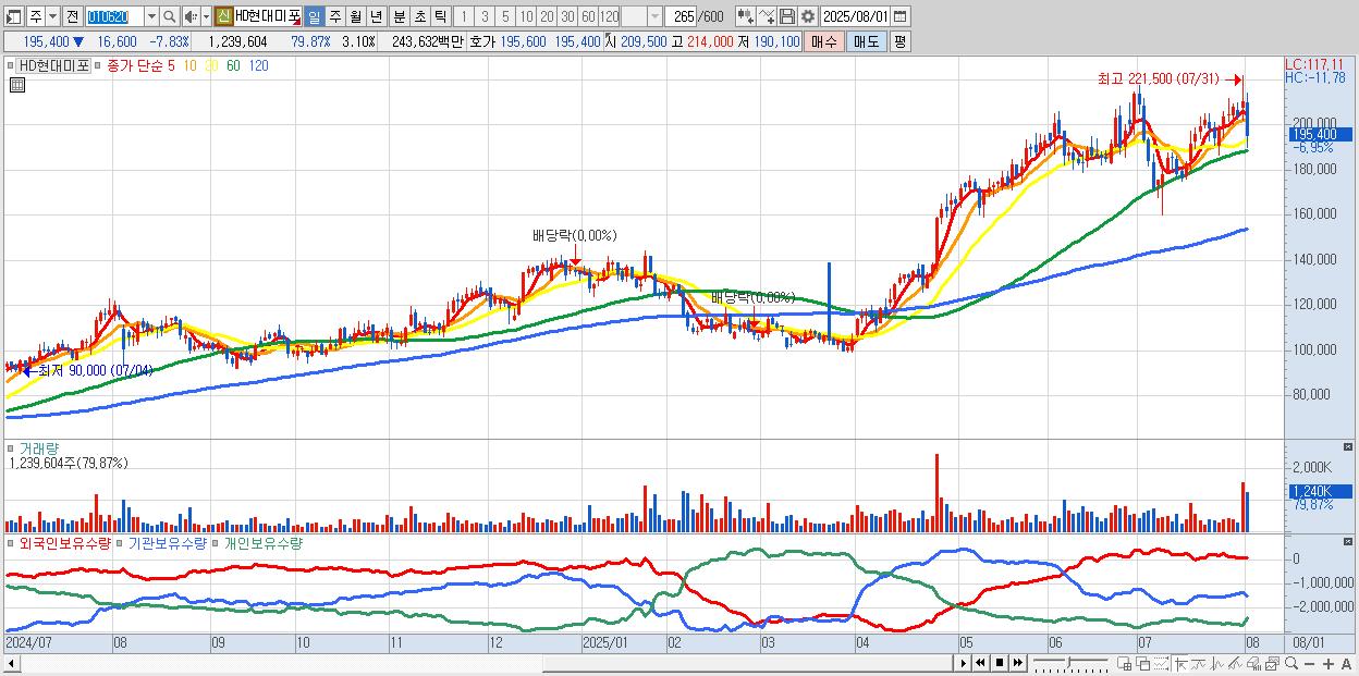 - HD현대미포 (195,600원 ▼ -7.74% , 시총: 78,127억, 거래량: 905,906, 거래대금:1,775억)