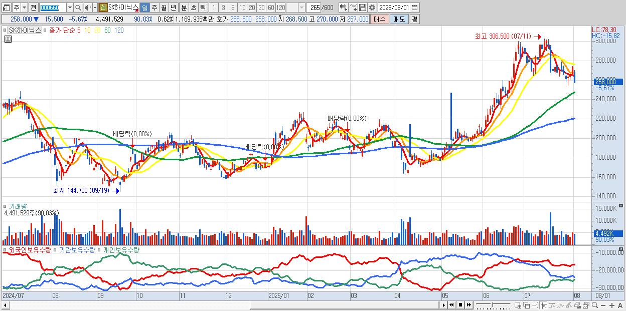 - SK하이닉스 (258,000원 ▼ -5.67% , 시총: 1,878,246억, 거래량: 3,227,394, 거래대금:8,396억)