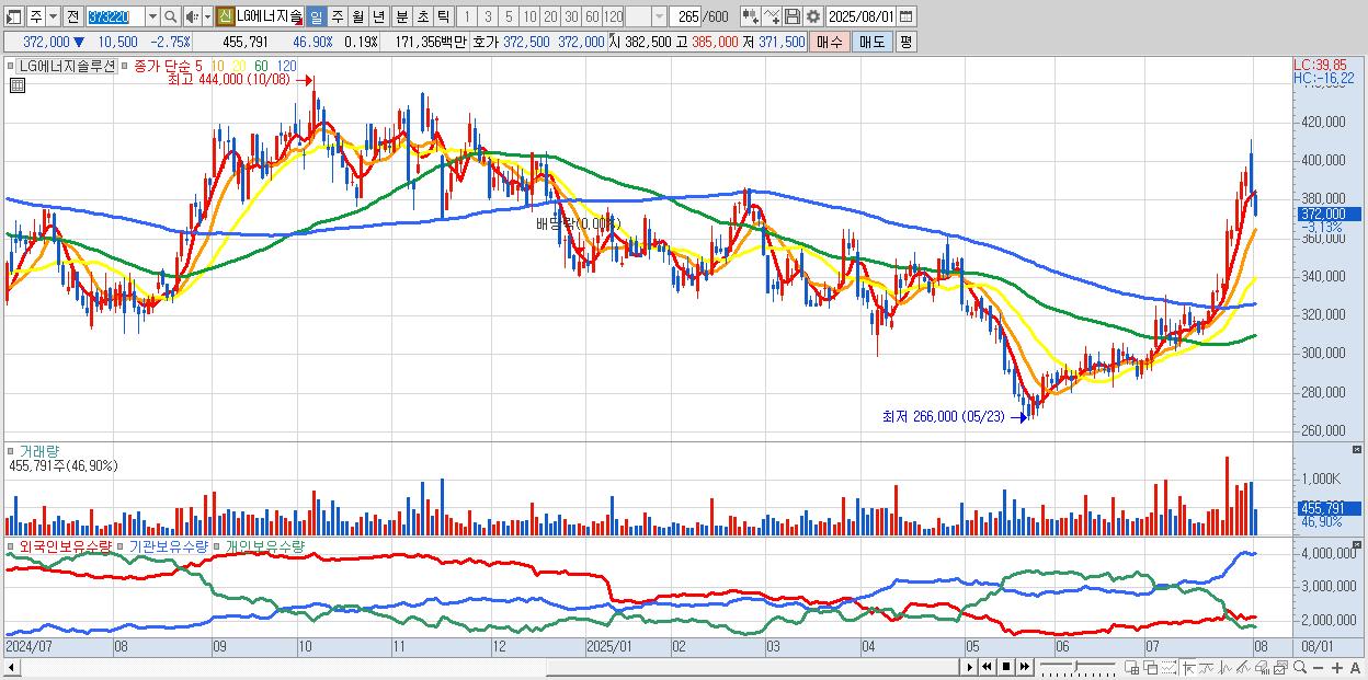 - LG에너지솔루션 (373,000원 ▼ -2.48% , 시총: 872,820억, 거래량: 339,780, 거래대금:1,277억)