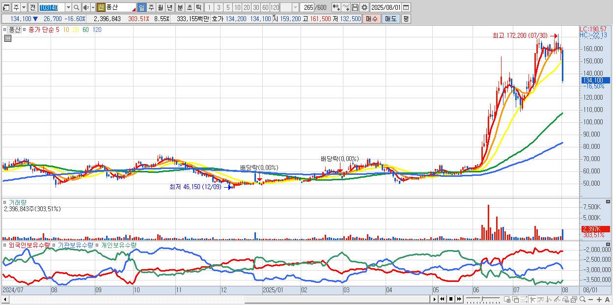 - 풍산 (135,500원 ▼ -15.73% , 시총: 37,973억, 거래량: 1,523,020, 거래대금:2,114억)