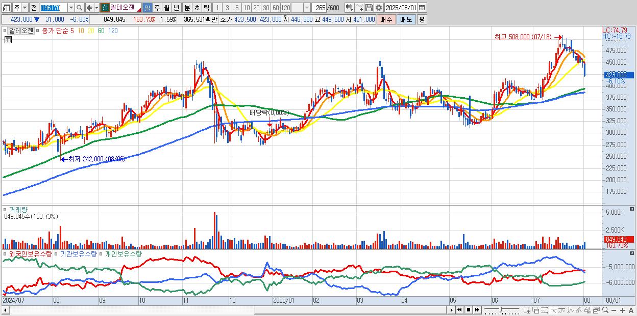 - 알테오젠 (422,000원 ▼ -7.05% , 시총: 225,622억, 거래량: 458,857, 거래대금:1,968억)