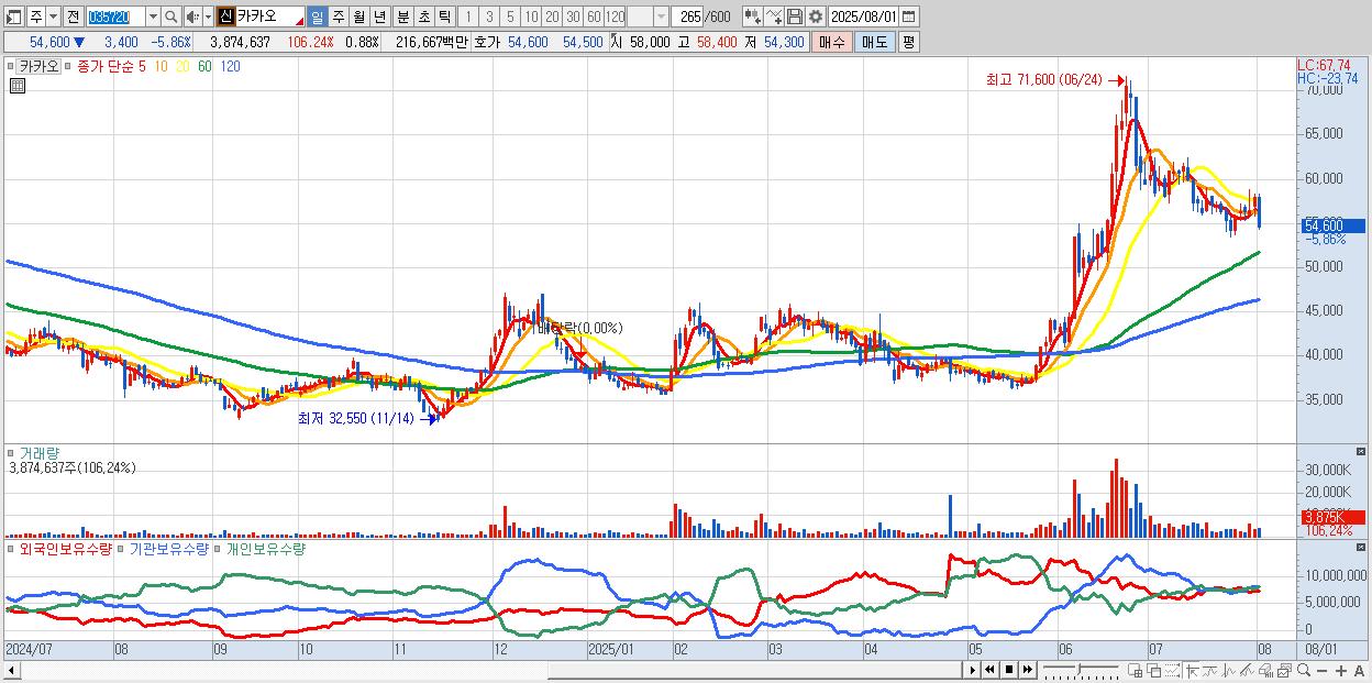 - 카카오 (55,500원 ▼ -4.31% , 시총: 245,318억, 거래량: 2,256,317, 거래대금:1,262억)