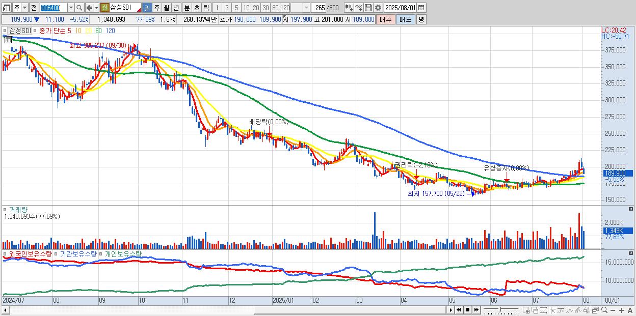 - 삼성SDI (190,000원 ▼ -5.47% , 시총: 153,113억, 거래량: 843,531, 거래대금:1,625억)