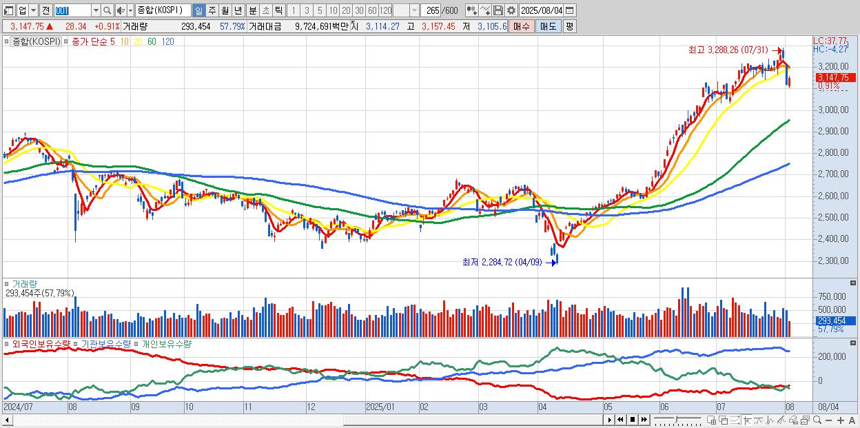 | 08/04 | 3,147.75 | ▲0.91% | -2,996억 | 830억 | 1,316억 | 850억 |