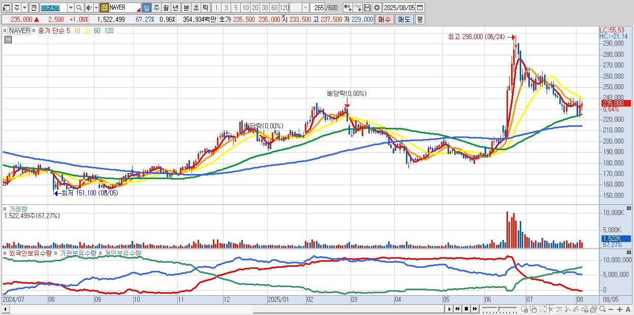 - NAVER (232,000원 ▼ -0.22% , 시총: 367,574억, 거래량: 683,813, 거래대금:1,588억)