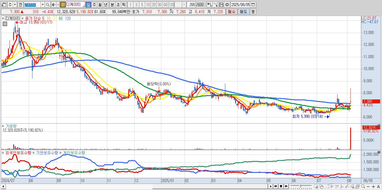 - 디케이티 (7,300원 ▲ 4.43% , 시총: 1,460억, 거래량: 12,320,628, 거래대금:990억)