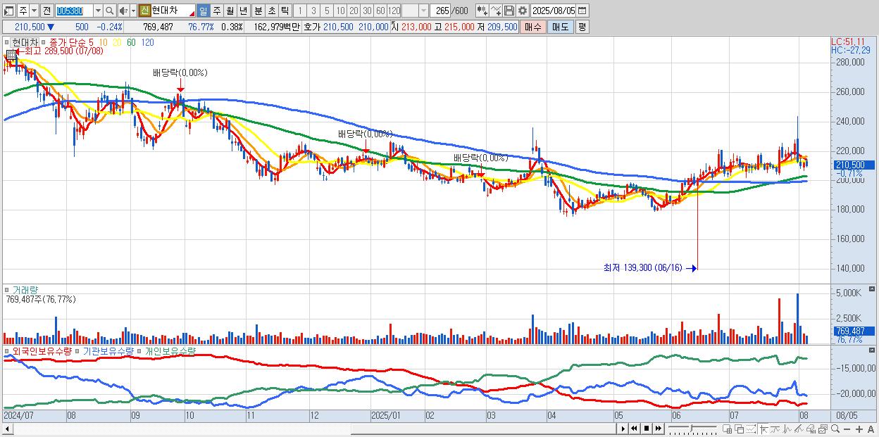- 현대차 (210,500원 ▼ -0.24% , 시총: 431,015억, 거래량: 480,510, 거래대금:1,017억)