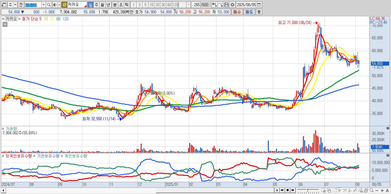 - 카카오 (54,700원 ▼ -1.26% , 시총: 241,782억, 거래량: 4,343,070, 거래대금:2,356억)