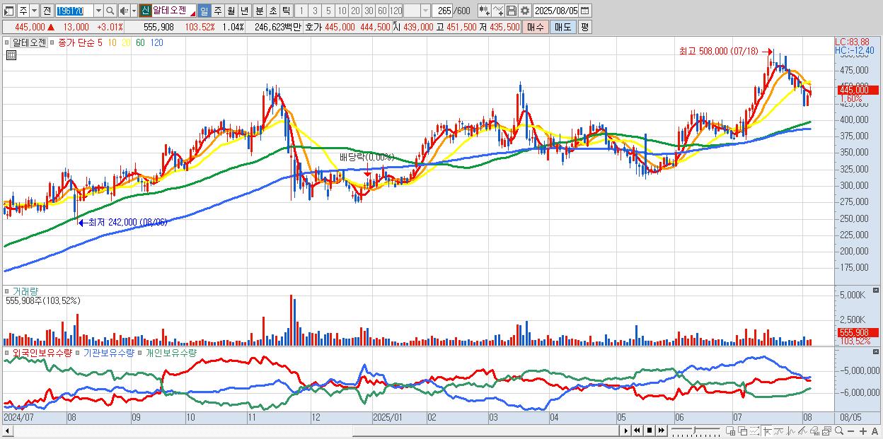 - 알테오젠 (444,000원 ▲ 2.78% , 시총: 237,384억, 거래량: 330,841, 거래대금:1,467억)