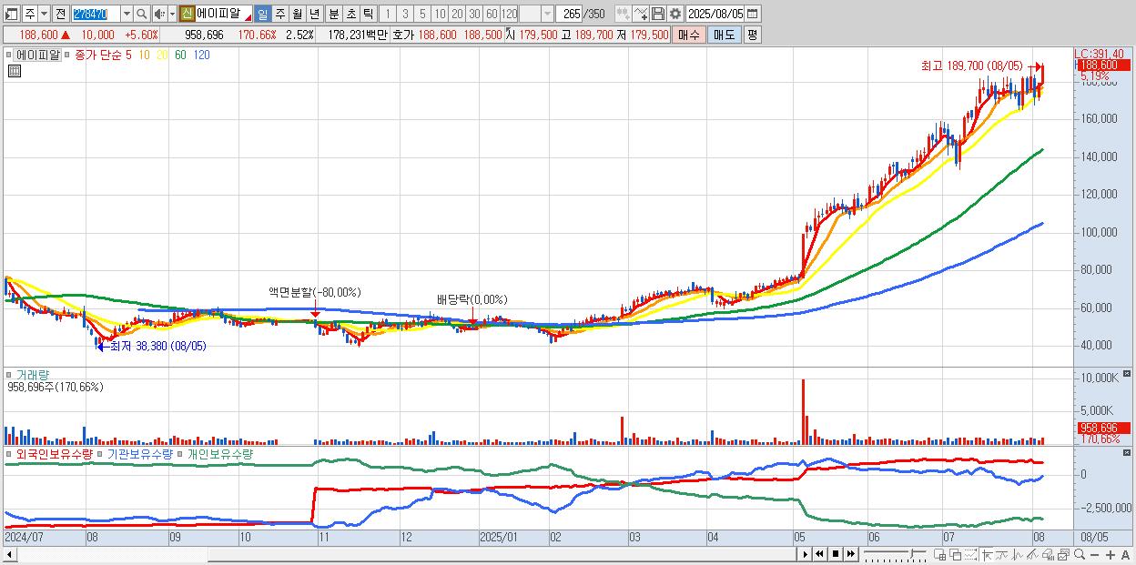 - 에이피알 (187,300원 ▲ 4.87% , 시총: 71,257억, 거래량: 595,552, 거래대금:1,108억)