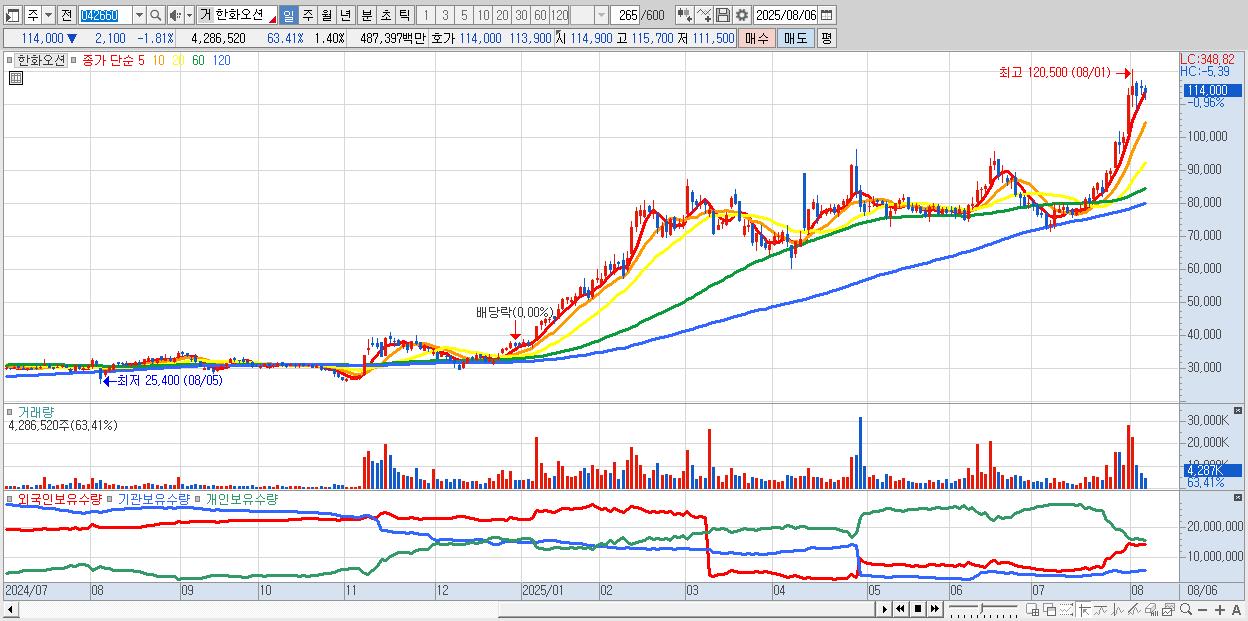 - 한화오션 (114,200원 ▼ -1.64% , 시총: 349,924억, 거래량: 2,253,902, 거래대금:2,562억)