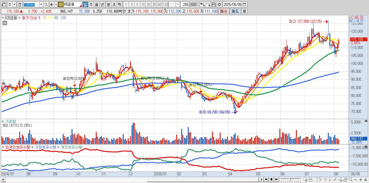 - KB금융 (115,600원 ▲ 2.85% , 시총: 440,970억, 거래량: 892,654, 거래대금:1,019억)