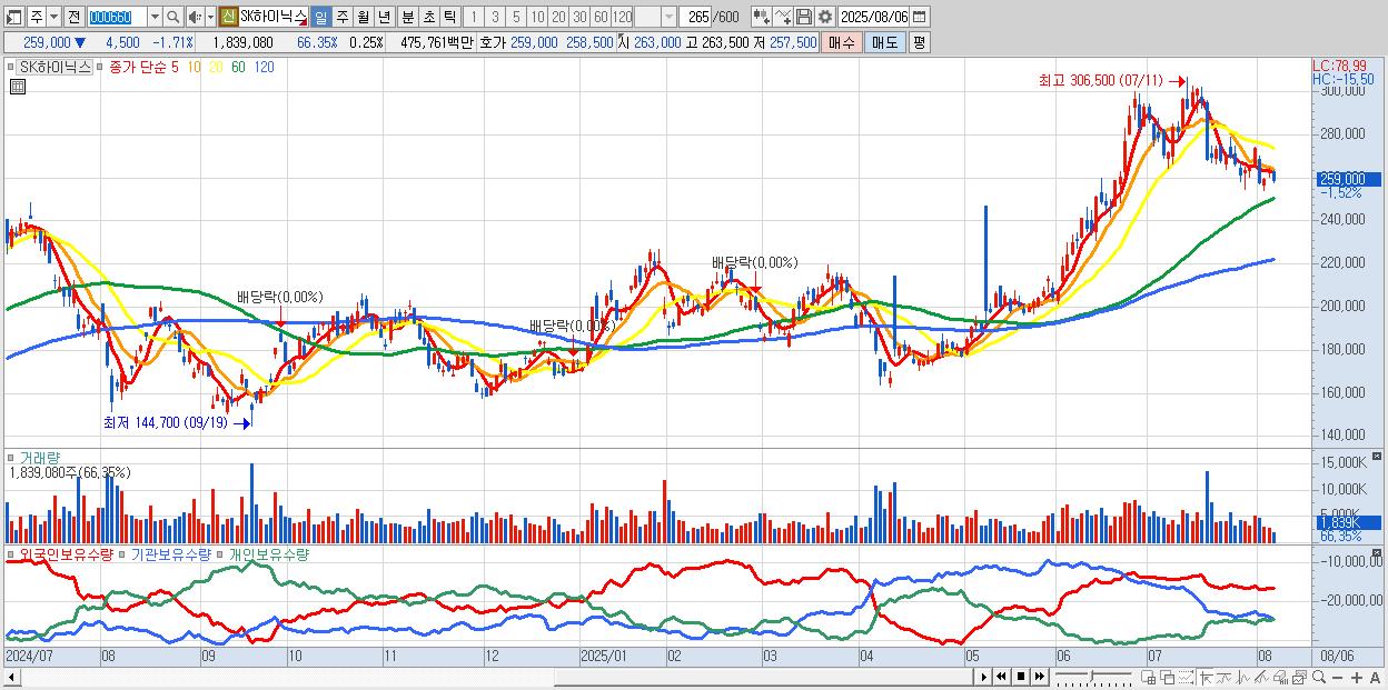 - SK하이닉스 (258,500원 ▼ -1.9% , 시총: 1,881,886억, 거래량: 1,374,559, 거래대금:3,555억)