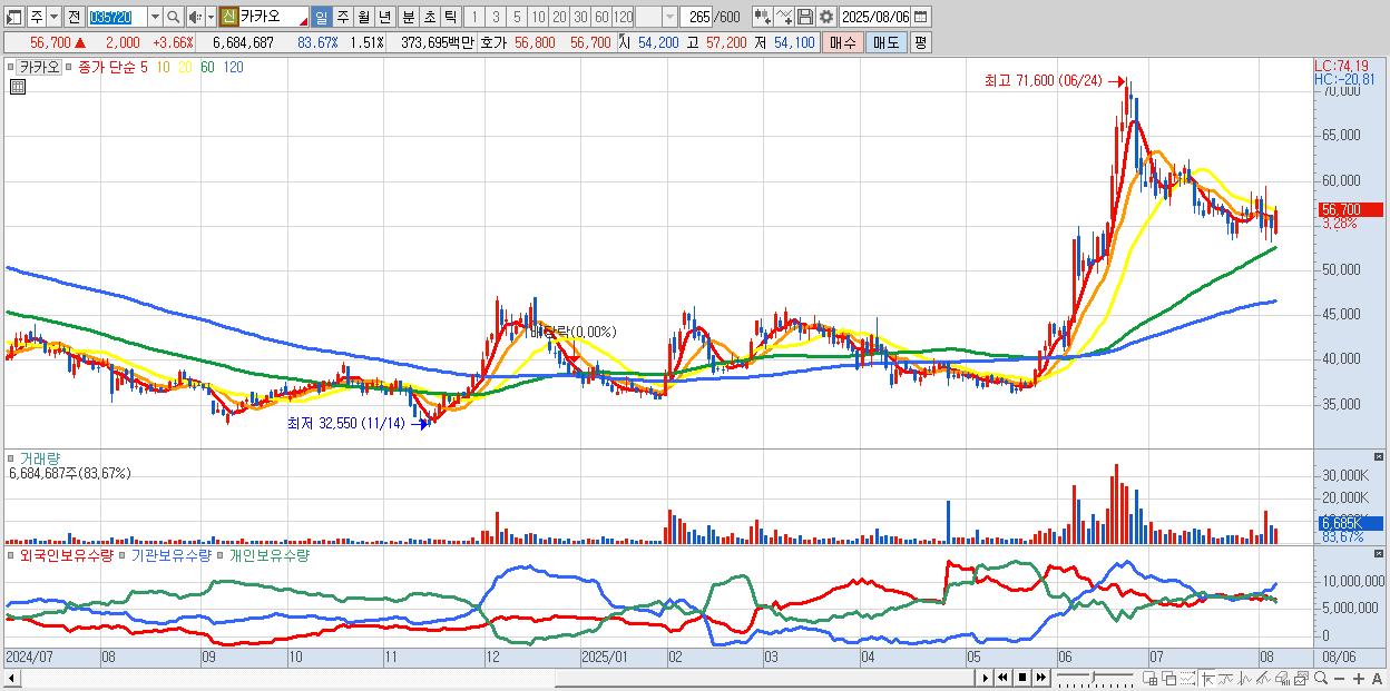 - 카카오 (56,800원 ▲ 3.84% , 시총: 251,064억, 거래량: 3,966,137, 거래대금:2,219억)