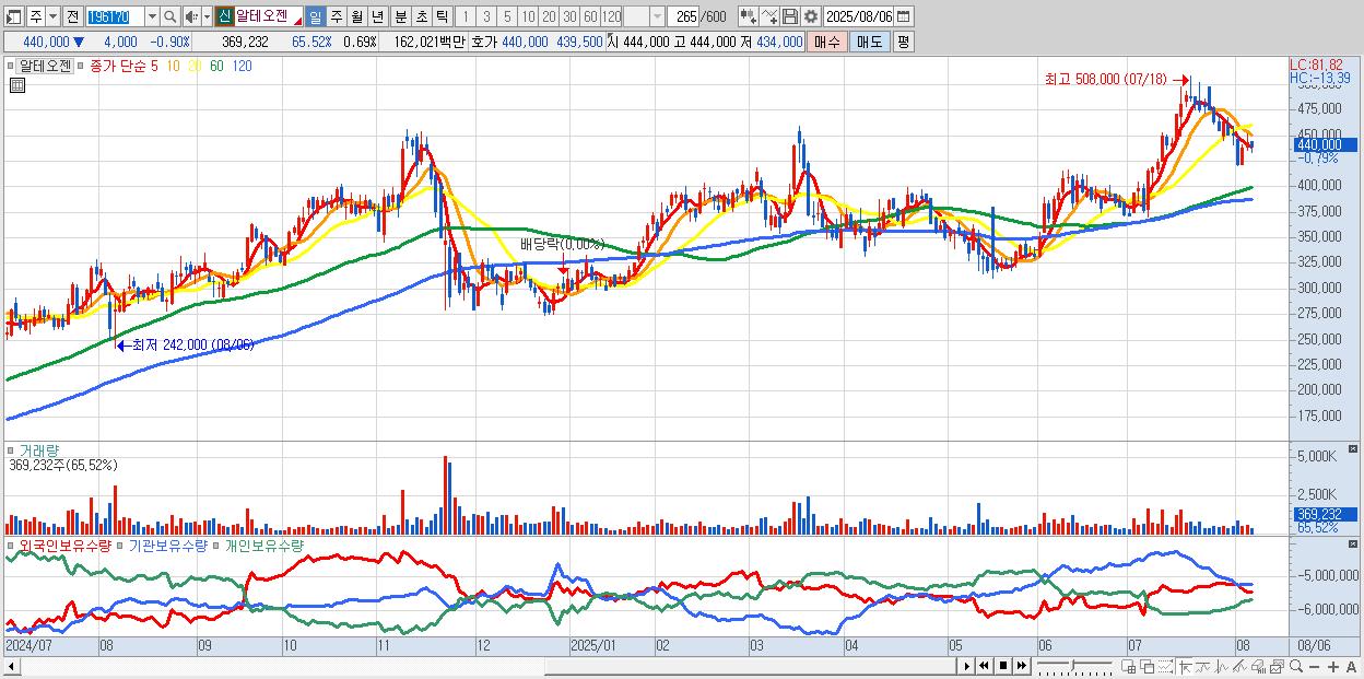 - 알테오젠 (439,500원 ▼ -1.01% , 시총: 234,979억, 거래량: 247,924, 거래대금:1,088억)