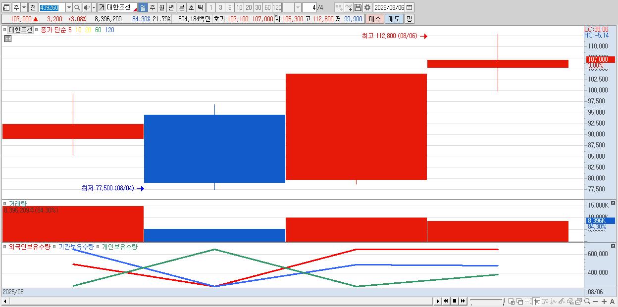 - 대한조선 (107,700원 ▲ 3.76% , 시총: 41,493억, 거래량: 3,420,820, 거래대금:3,645억)