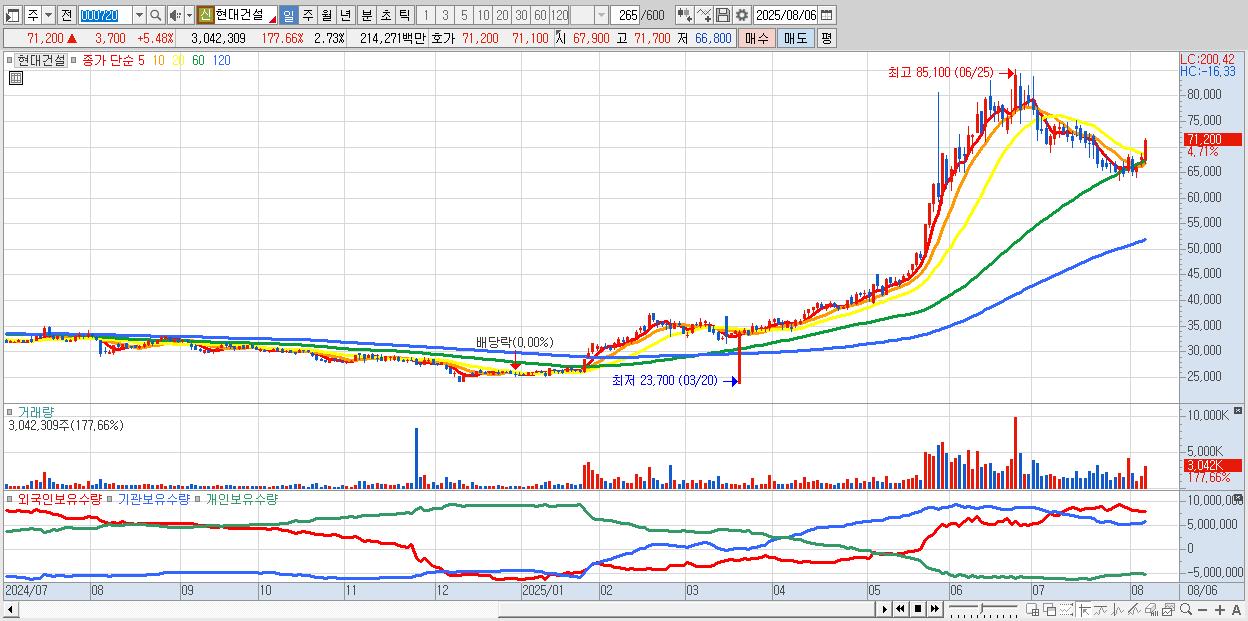 - 현대건설 (71,200원 ▲ 5.48% , 시총: 79,285억, 거래량: 2,094,151, 거래대금:1,477억)