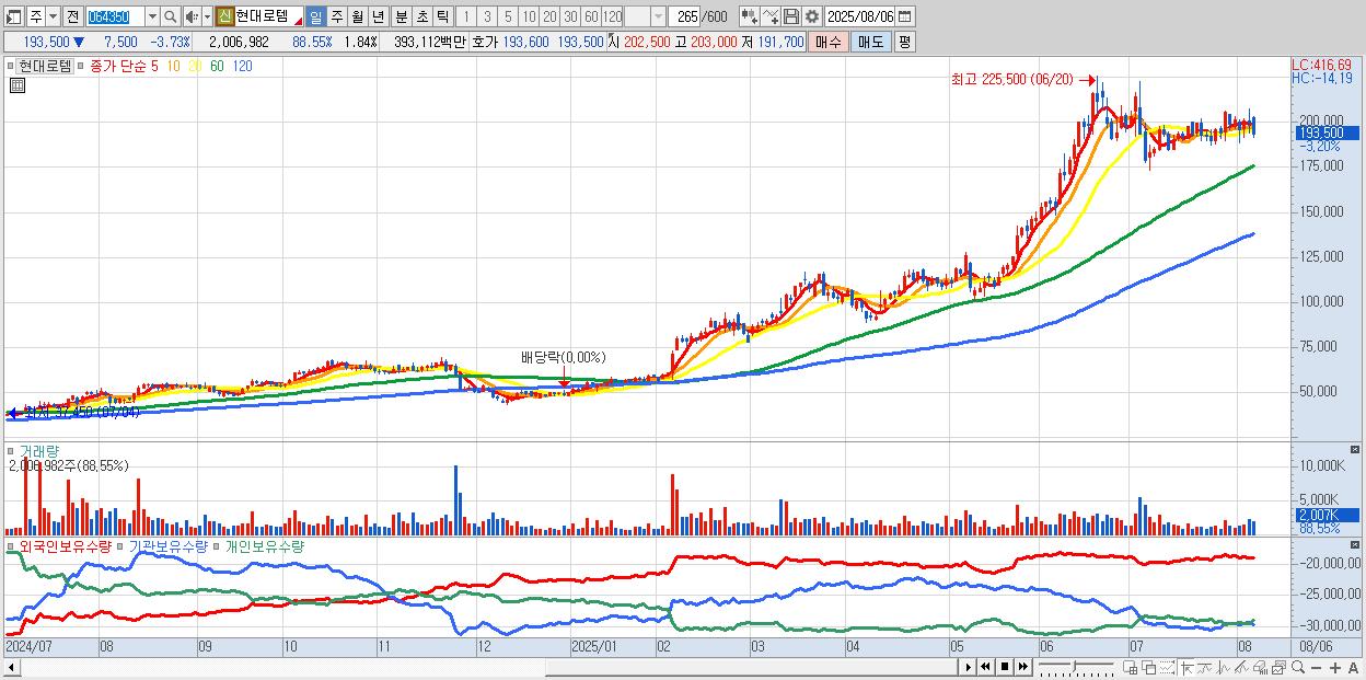 - 현대로템 (197,400원 ▼ -1.79% , 시총: 215,447억, 거래량: 1,326,751, 거래대금:2,597억)