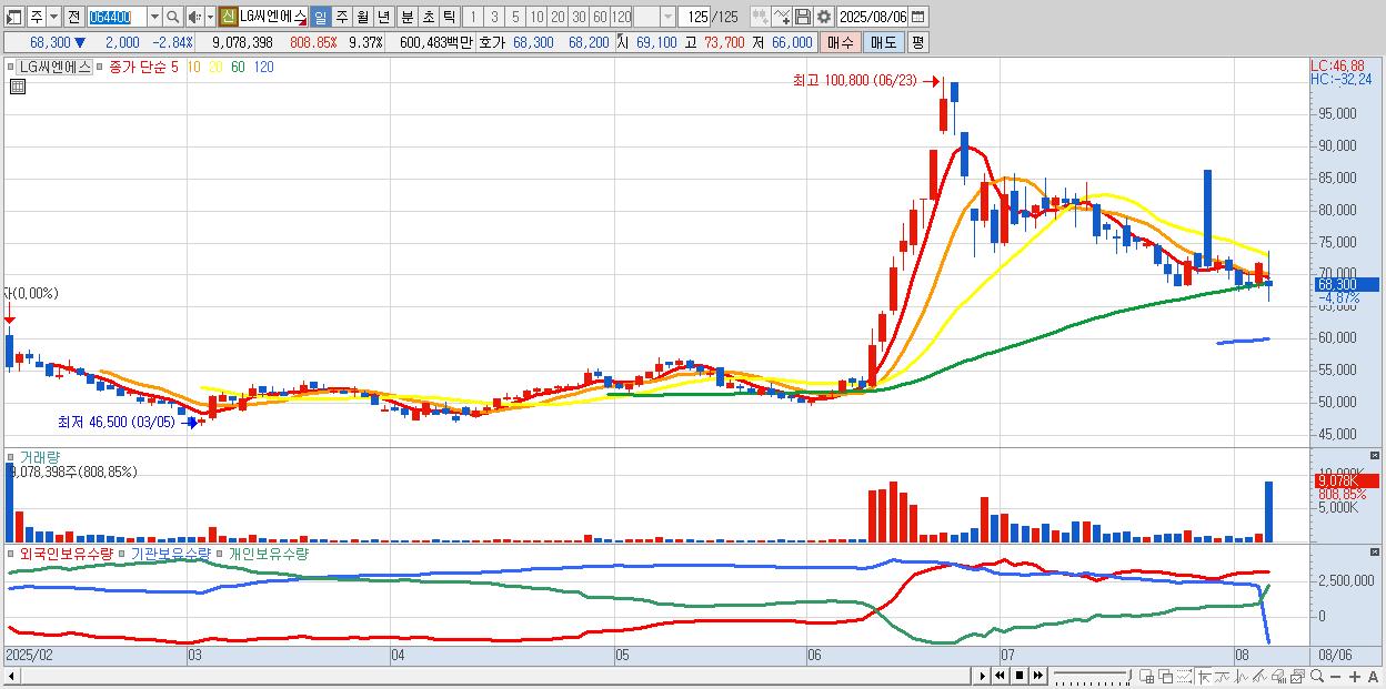 - LG씨엔에스 (67,500원 ▼ -3.98% , 시총: 65,398억, 거래량: 7,564,714, 거래대금:4,947억)