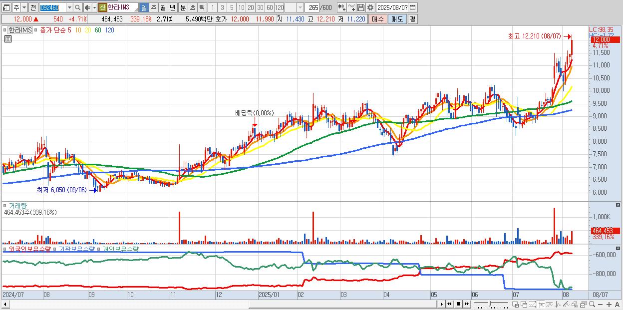 - 한라IMS (12,000원 ▲ 4.71% , 시총: 2,053억, 거래량: 464,453, 거래대금:55억, KOSDAQ)
