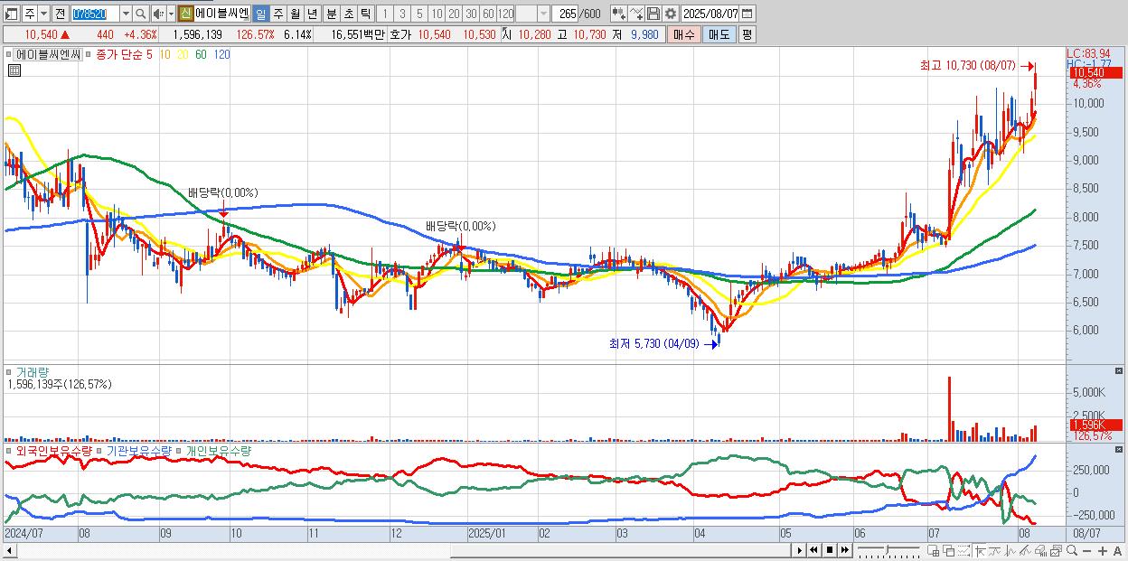 - 에이블씨엔씨 (10,540원 ▲ 4.36% , 시총: 2,742억, 거래량: 1,596,139, 거래대금:166억, KOSPI)